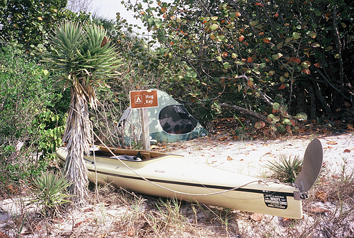 Ich konnte es kaum erwarten, von meinem Ranger Freund John im Flamingo Campingplatz mit Boot, Paddel, Schwimmweste und kleiner Propankartusche für meinen Kocher abgesetzt zu werden und mein Zelt aufzuschlagen, grad als die Sonne hinter den Palmen am Ufer versank.
