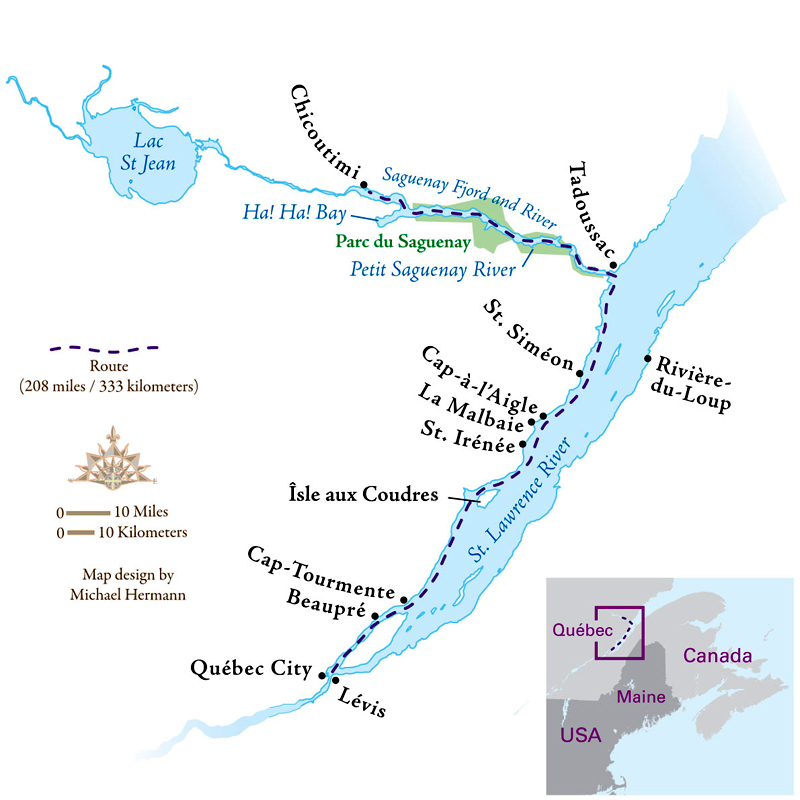 Vor zehn Jahren(1999) paddelte ich mein Solo See-Kanu/Kanadier 1000 Meilen (1600 km) von Lake Champlain in den St. Lorenz, an Québec vorbei und dann entlang der Appalachen Bergkette um die Gaspé Halbinsel herum zurück nach New Brunswick. In zwei weiteren Sommern wollte ich nun einmal den gesamten St. Lorenz Strom von dem letzten der großen Seen, Lake Ontario, entlang der Nordküste, der laurentischen Gebirgskette, bis weit raus nach Tadoussac paddeln. Die 113 km von dort den Saguenay Fjord hoch nach Chicoutimi sollten wie ein leckerer Nachtisch der Höhepunkt meiner Fahrt werden. Den ganzen St. Lorenz Strom zu paddeln sowie den Saguenay Fjord einmal zu sehen, war schon immer mein Wunsch gewesen, besonders aber, nachdem ich Hans-Otto Meissners Buch Kundschafter am St. Lorenz Strom gelesen hatte.